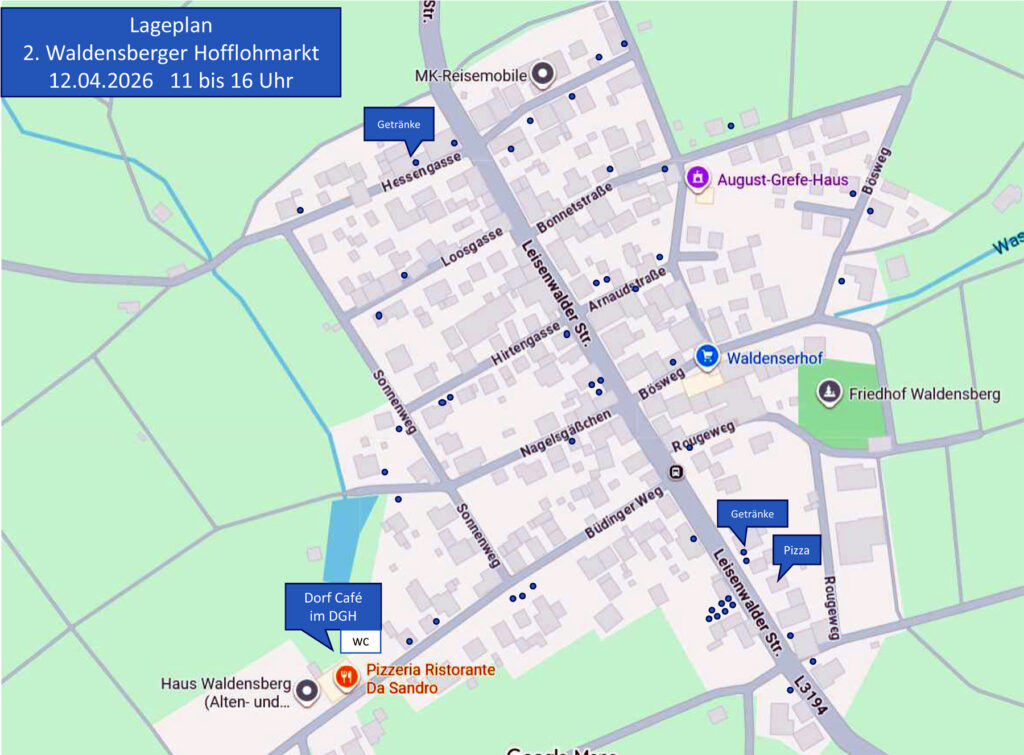 WaldensergemeindeWaldensberg Alte Schule und Kirche Ehemaliger Dorfbrunnen Begrüßung Ortseingang Kleine Parkanlage Waldenser Trachten Bekanntmachungen Die Laienspiele führen an zwei Samstagen ihr Theaterstück auf!14.03.2026 ist ausverkauft.21.03.2026 sind noch Karten zu haben. Osterfeuer am Weiherhof 2. Auflage 2. Waldensberger Hofflohmarktmit Dorfcafé im Dorfgemeinschaftshausam Sonntag 12. April 2026von 11 Uhr bis 16 Uhr Der Lageplandie blauen Punkte markieren die Verkaufsstellen in den einzelnen Höfen Impressum Datenschutz Neues auf der Web-Seite